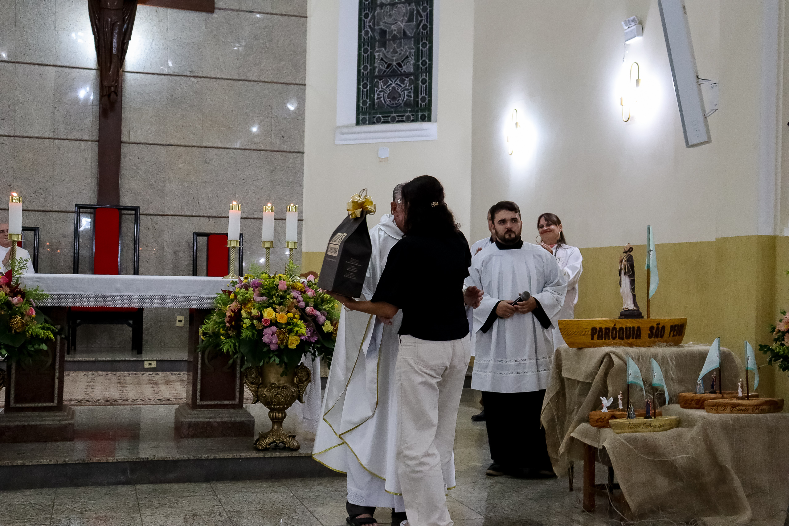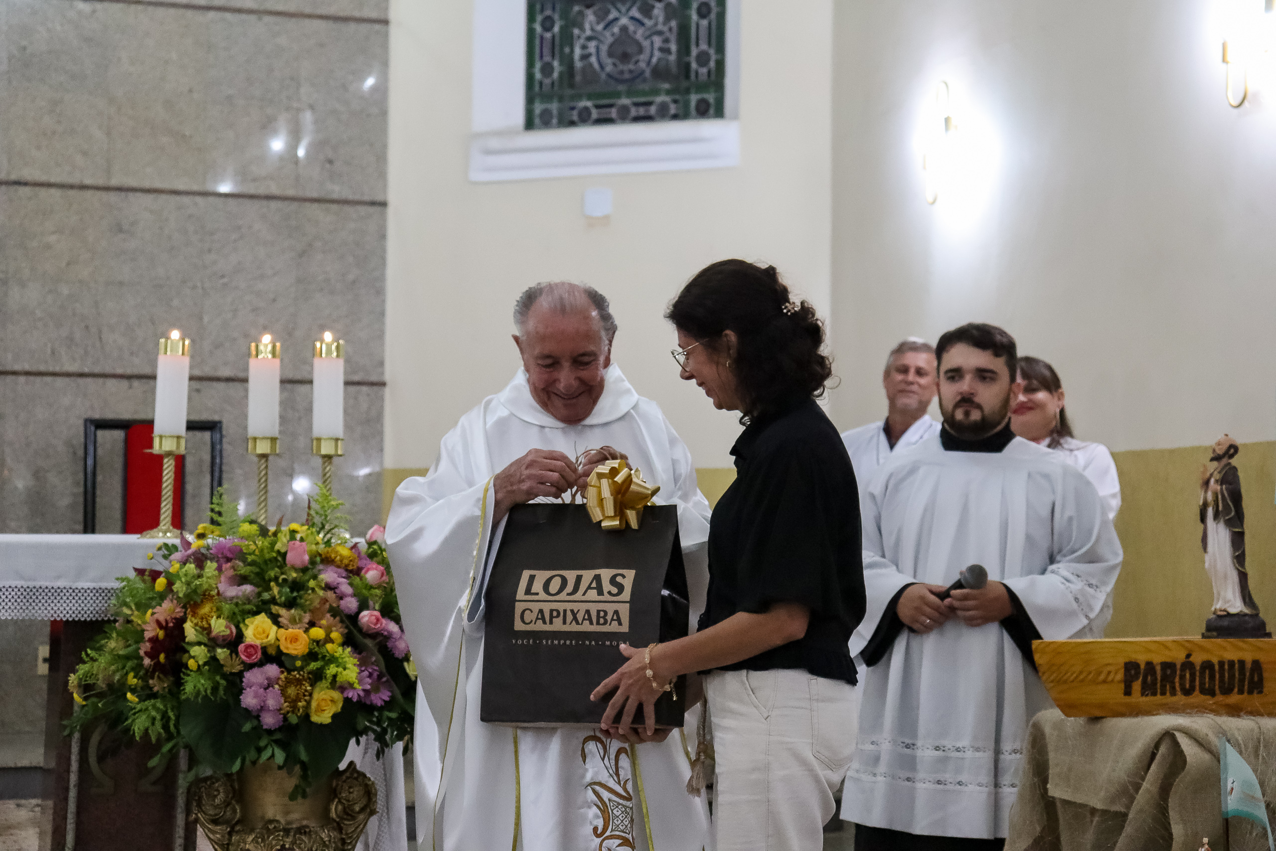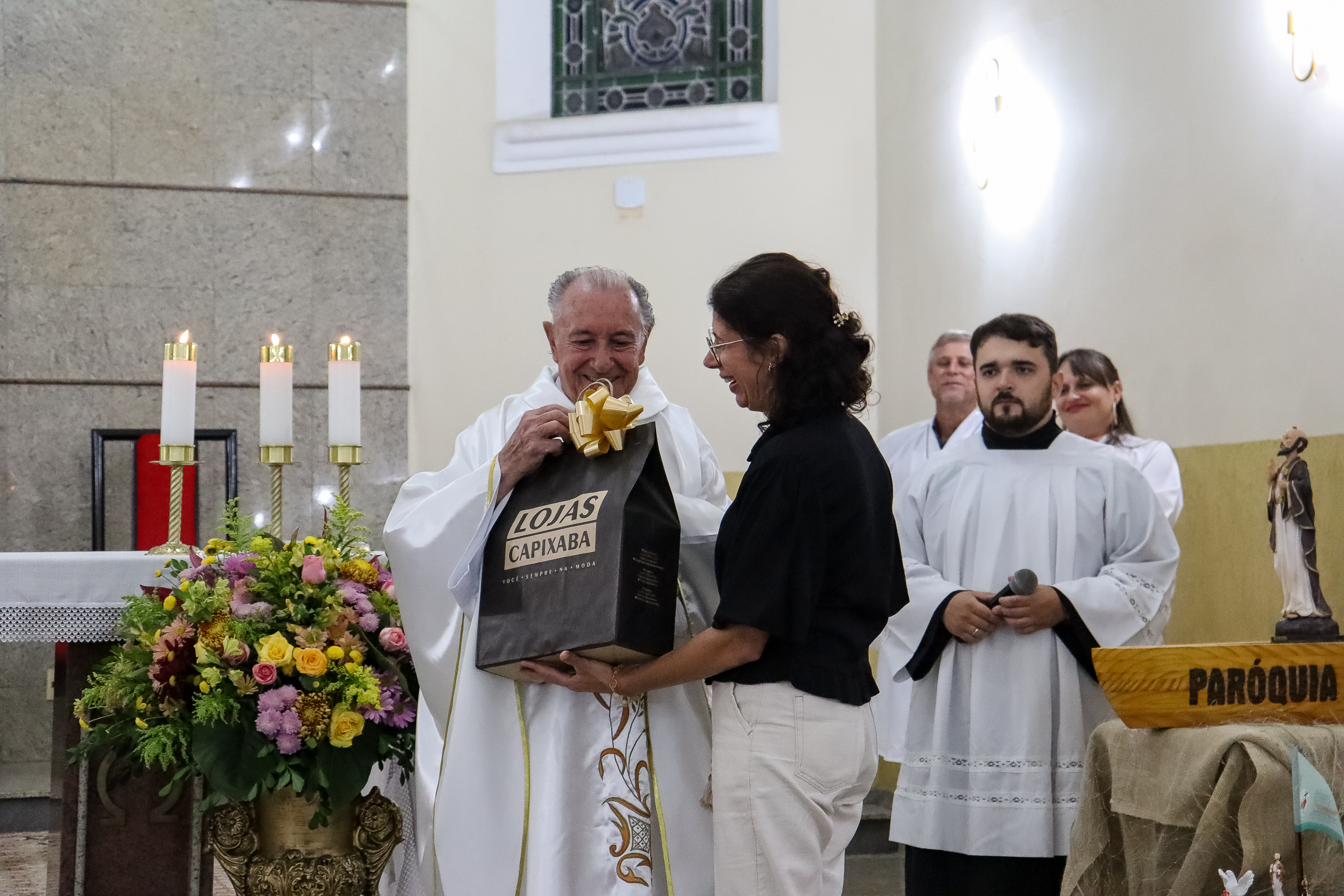 Ao final da celebração, a comunidade preparou uma homenagem especial ao Padre Oliveiro, entregando-lhe um presente como forma de agradecimento pelo carinho, dedicação e presença constante em nossas vidas. O gesto emocionou a todos e expressou a gratidão da paróquia por sua caminhada conosco.