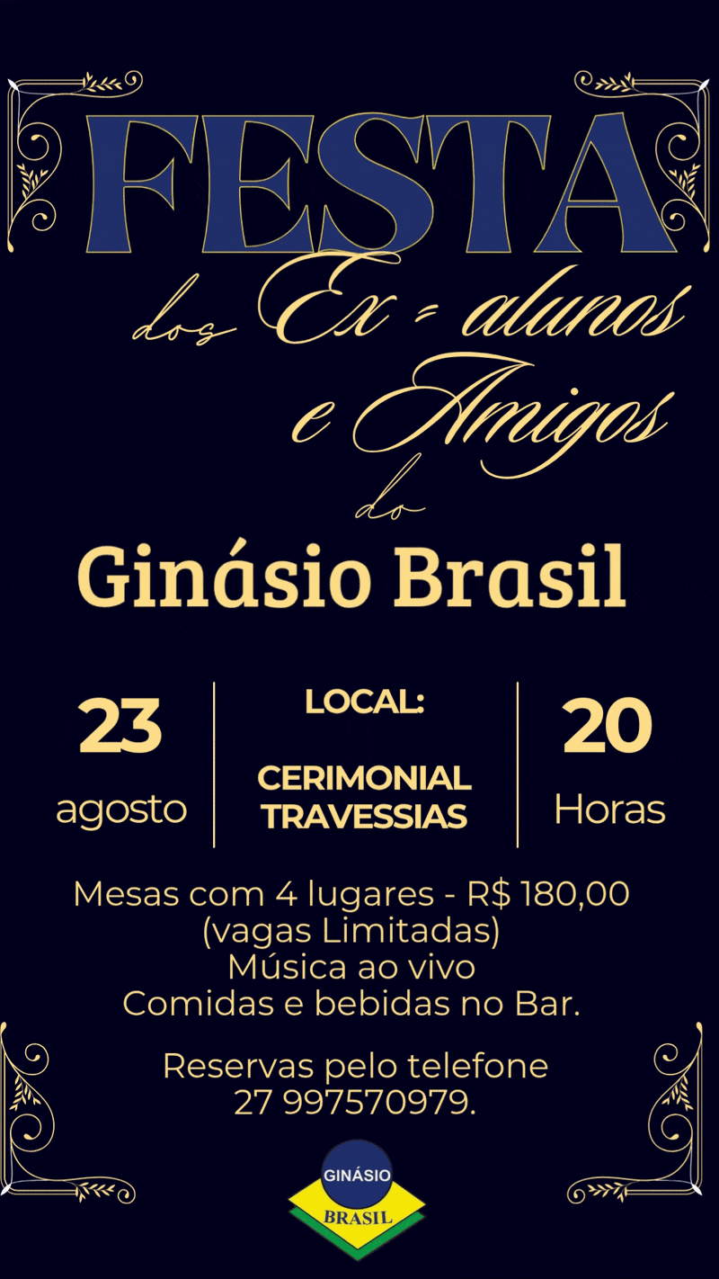É com grande alegria que anunciamos um reencontro muito especial: a Festa dos Ex-alunos e Amigos do Ginásio Brasil, marcada para o dia 23 de agosto, às 20:00, no Cerimonial Travessia.
